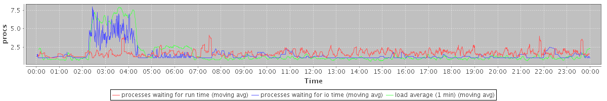 avg(processes waiting for run time) = 0.89 avg(processes waiting for io time) = 0.64 avg(load average (1 min)) = 1.60