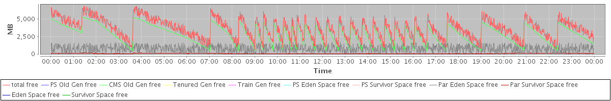 avg(total free) = 3614.84 avg(PS Old Gen free) = 0.00 avg(CMS Old Gen free) = 2758.92 avg(Tenured Gen free) = 0.00 avg(Train Gen free) = 0.00 avg(PS Eden Space free) = 0.00 avg(PS Survivor Space free) = 0.00 avg(Par Eden Space free) = 781.54 avg(Par Survivor Space free) = 74.38 avg(Eden Space free) = 0.00 avg(Survivor Space free) = 0.00