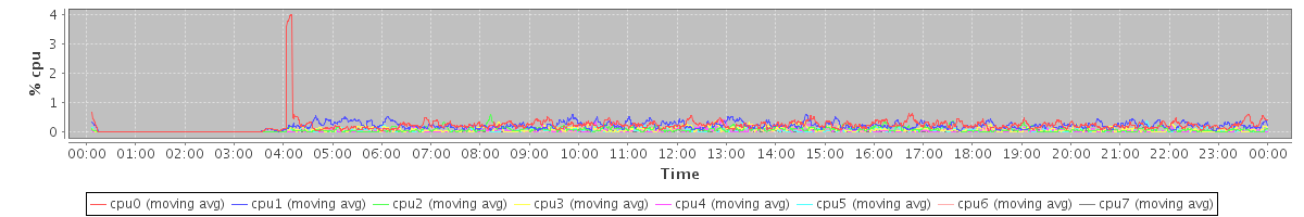 avg(cpu0) = 0.15 avg(cpu1) = 0.17 avg(cpu2) = 0.10 avg(cpu3) = 0.12 avg(cpu4) = 0.06 avg(cpu5) = 0.06 avg(cpu6) = 0.03 avg(cpu7) = 0.04