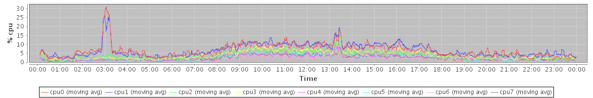 avg(cpu0) = 1.08 avg(cpu1) = 1.07 avg(cpu2) = 0.67 avg(cpu3) = 0.71 avg(cpu4) = 0.45 avg(cpu5) = 0.45 avg(cpu6) = 0.32 avg(cpu7) = 0.36
