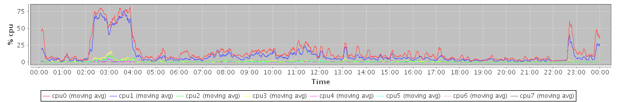 avg(cpu0) = 0.77 avg(cpu1) = 0.73 avg(cpu2) = 0.45 avg(cpu3) = 0.43 avg(cpu4) = 0.29 avg(cpu5) = 0.30 avg(cpu6) = 0.24 avg(cpu7) = 0.22