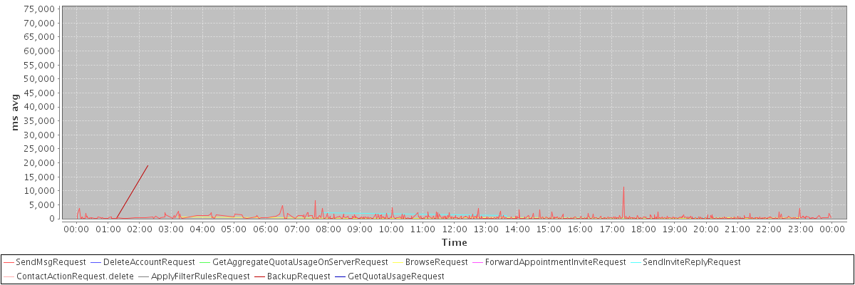 avg(SendMsgRequest) = 491.12 avg(DeleteAccountRequest) = 72573.00 avg(GetAggregateQuotaUsageOnServerRequest) = 1684.00 avg(BrowseRequest) = 303.75 avg(ForwardAppointmentInviteRequest) = 241.00 avg(SendInviteReplyRequest) = 584.11 avg(ContactActionRequest.delete) = 474.00 avg(ApplyFilterRulesRequest) = 513.00 avg(BackupRequest) = 9611.00 avg(GetQuotaUsageRequest) = 2557.00