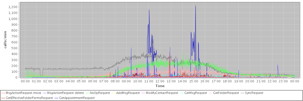 max(MsgActionRequest.move) = 427.00 max(MsgActionRequest.delete) = 518.00 max(NoOpRequest) = 428.00 max(AddMsgRequest) = 138.00 max(ModifyContactRequest) = 136.00 max(GetMsgRequest) = 167.00 max(GetFolderRequest) = 338.00 max(SyncRequest) = 655.00 max(GetEffectiveFolderPermsRequest) = 160.00 max(GetAppointmentRequest) = 1223.00