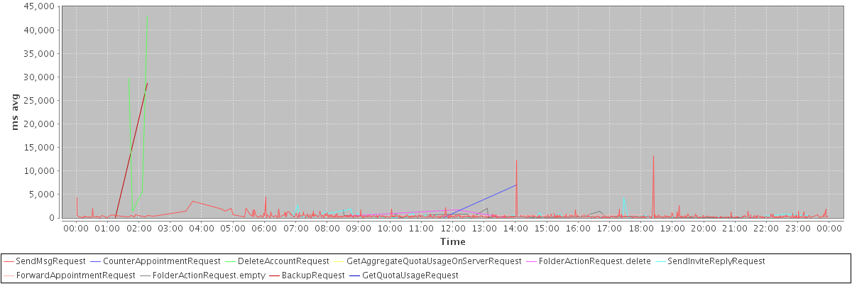 avg(SendMsgRequest) = 366.87 avg(CounterAppointmentRequest) = 3560.50 avg(DeleteAccountRequest) = 19899.25 avg(GetAggregateQuotaUsageOnServerRequest) = 1395.00 avg(FolderActionRequest.delete) = 748.67 avg(SendInviteReplyRequest) = 428.57 avg(ForwardAppointmentRequest) = 383.00 avg(FolderActionRequest.empty) = 381.06 avg(BackupRequest) = 14372.00 avg(GetQuotaUsageRequest) = 1921.00
