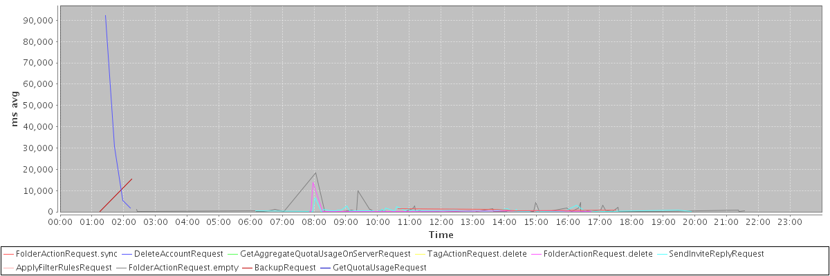 avg(FolderActionRequest.sync) = 958.00 avg(DeleteAccountRequest) = 32481.25 avg(GetAggregateQuotaUsageOnServerRequest) = 2792.00 avg(TagActionRequest.delete) = 1510.00 avg(FolderActionRequest.delete) = 1677.67 avg(SendInviteReplyRequest) = 707.13 avg(ApplyFilterRulesRequest) = 3648.00 avg(FolderActionRequest.empty) = 1037.62 avg(BackupRequest) = 7884.00 avg(GetQuotaUsageRequest) = 3861.00