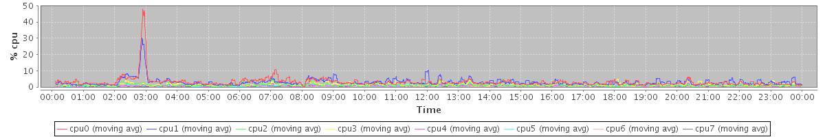 avg(cpu0) = 3.07 avg(cpu1) = 2.98 avg(cpu2) = 1.10 avg(cpu3) = 1.43 avg(cpu4) = 0.73 avg(cpu5) = 0.86 avg(cpu6) = 0.62 avg(cpu7) = 0.58