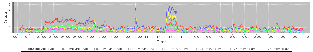 avg(cpu0) = 1.16 avg(cpu1) = 1.17 avg(cpu2) = 0.75 avg(cpu3) = 0.72 avg(cpu4) = 0.42 avg(cpu5) = 0.42 avg(cpu6) = 0.28 avg(cpu7) = 0.39