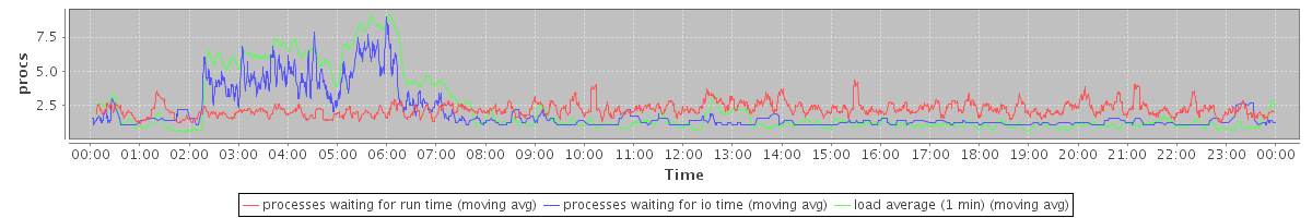 avg(processes waiting for run time) = 1.72 avg(processes waiting for io time) = 1.17 avg(load average (1 min)) = 2.24