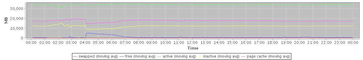 avg(swapped) = 10.76 avg(free) = 943.16 avg(active) = 34061.27 avg(inactive) = 12130.81 avg(page cache) = 17577.67