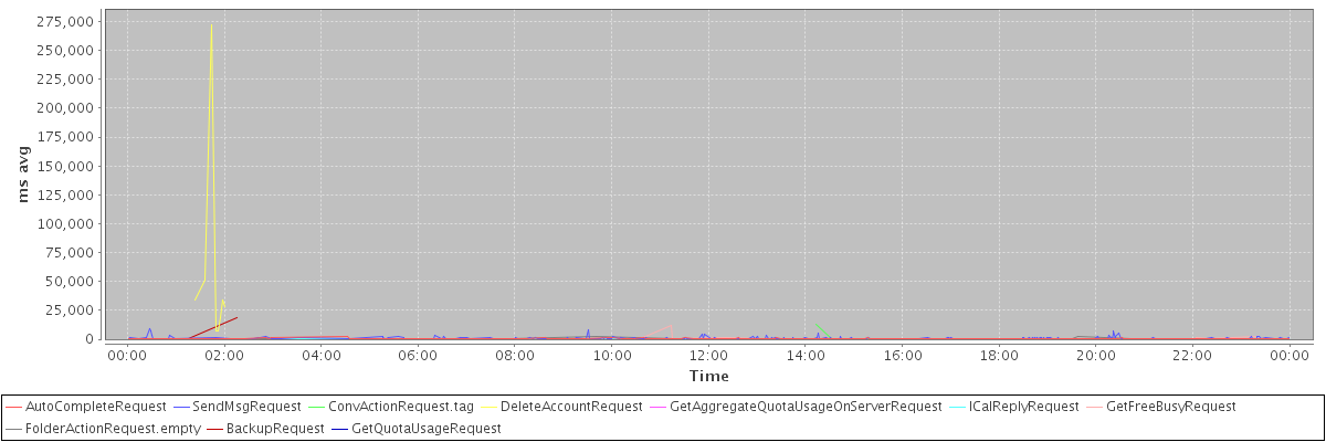 avg(AutoCompleteRequest) = 240.74 avg(SendMsgRequest) = 630.11 avg(ConvActionRequest.tag) = 1332.00 avg(DeleteAccountRequest) = 56601.75 avg(GetAggregateQuotaUsageOnServerRequest) = 1670.00 avg(ICalReplyRequest) = 265.50 avg(GetFreeBusyRequest) = 546.32 avg(FolderActionRequest.empty) = 480.50 avg(BackupRequest) = 9499.00 avg(GetQuotaUsageRequest) = 2030.00