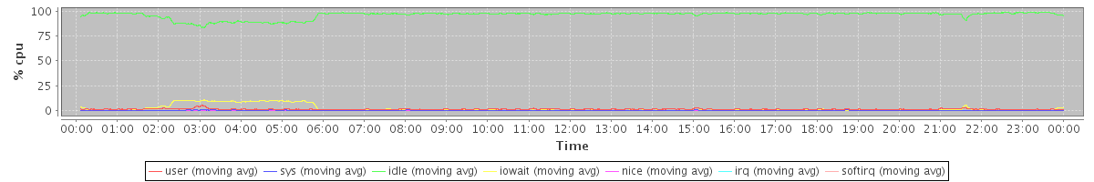 avg(user) = 1.40 avg(sys) = 0.28 avg(idle) = 96.14 avg(iowait) = 2.07 avg(nice) = 0.09 avg(irq) = 0.00 avg(softirq) = 0.02