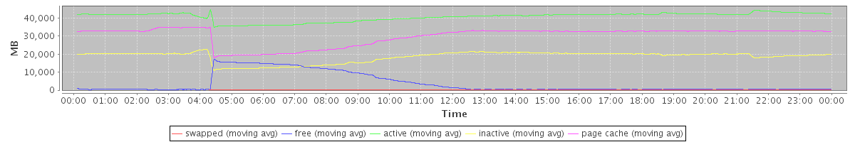 avg(swapped) = 1.86 avg(free) = 3601.04 avg(active) = 40744.31 avg(inactive) = 18531.38 avg(page cache) = 30146.56