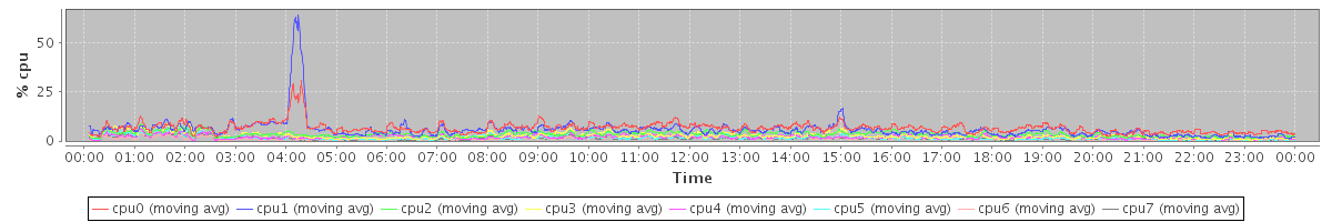 avg(cpu0) = 7.85 avg(cpu1) = 11.49 avg(cpu2) = 0.55 avg(cpu3) = 0.52 avg(cpu4) = 0.11 avg(cpu5) = 0.25 avg(cpu6) = 0.03 avg(cpu7) = 0.07