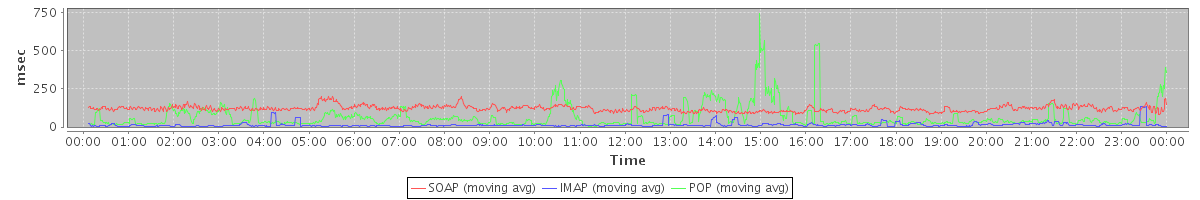 avg(SendMsgRequest) = 362.64 avg(DeleteAccountRequest) = 9827.71 avg(BackupQueryRequest) = 272.80 avg(GetAggregateQuotaUsageOnServerRequest) = 4588.00 avg(CreateAppointmentExceptionRequest) = 321.33 avg(SendInviteReplyRequest) = 465.71 avg(RemoveAttachmentsRequest) = 1069.54 avg(ModifyPrefsRequest) = 1498.30 avg(BackupRequest) = 13840.00 avg(GetQuotaUsageRequest) = 6094.00