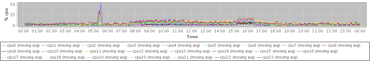 avg(cpu0) = 1.33 avg(cpu1) = 1.32 avg(cpu2) = 0.90 avg(cpu3) = 0.88 avg(cpu4) = 0.73 avg(cpu5) = 0.63 avg(cpu6) = 0.48 avg(cpu7) = 0.43 avg(cpu8) = 0.35 avg(cpu9) = 0.31 avg(cpu10) = 0.78 avg(cpu11) = 0.25 avg(cpu12) = 0.45 avg(cpu13) = 0.54 avg(cpu14) = 1.07 avg(cpu15) = 1.13 avg(cpu16) = 0.60 avg(cpu17) = 0.62 avg(cpu18) = 0.49 avg(cpu19) = 0.51 avg(cpu20) = 0.40 avg(cpu21) = 0.23 avg(cpu22) = 0.33 avg(cpu23) = 0.21