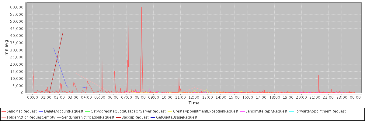 avg(SendMsgRequest) = 878.00 avg(DeleteAccountRequest) = 9479.80 avg(GetAggregateQuotaUsageOnServerRequest) = 3772.00 avg(CreateAppointmentExceptionRequest) = 368.52 avg(SendInviteReplyRequest) = 459.13 avg(ForwardAppointmentRequest) = 344.00 avg(FolderActionRequest.empty) = 810.85 avg(SendShareNotificationRequest) = 468.17 avg(BackupRequest) = 21503.50 avg(GetQuotaUsageRequest) = 5002.00