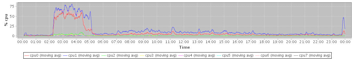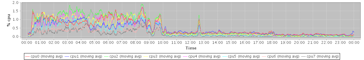avg(cpu0) = 2.34 avg(cpu1) = 1.91 avg(cpu2) = 2.40 avg(cpu3) = 1.99 avg(cpu4) = 2.03 avg(cpu5) = 1.49 avg(cpu6) = 1.25 avg(cpu7) = 0.76