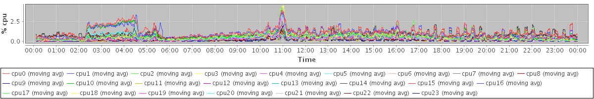 avg(cpu0) = 1.08 avg(cpu1) = 1.01 avg(cpu2) = 0.63 avg(cpu3) = 0.59 avg(cpu4) = 0.44 avg(cpu5) = 0.48 avg(cpu6) = 0.35 avg(cpu7) = 0.30 avg(cpu8) = 0.25 avg(cpu9) = 0.21 avg(cpu10) = 0.70 avg(cpu11) = 0.18 avg(cpu12) = 0.39 avg(cpu13) = 0.42 avg(cpu14) = 0.86 avg(cpu15) = 0.90 avg(cpu16) = 0.48 avg(cpu17) = 0.53 avg(cpu18) = 0.42 avg(cpu19) = 0.37 avg(cpu20) = 0.34 avg(cpu21) = 0.16 avg(cpu22) = 0.28 avg(cpu23) = 0.16