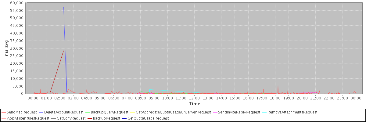 avg(SendMsgRequest) = 285.77 avg(DeleteAccountRequest) = 28550.00 avg(BackupQueryRequest) = 309.00 avg(GetAggregateQuotaUsageOnServerRequest) = 1382.00 avg(SendInviteReplyRequest) = 224.04 avg(RemoveAttachmentsRequest) = 1535.80 avg(ApplyFilterRulesRequest) = 1415.00 avg(GetConvRequest) = 252.00 avg(BackupRequest) = 14245.50 avg(GetQuotaUsageRequest) = 2022.00