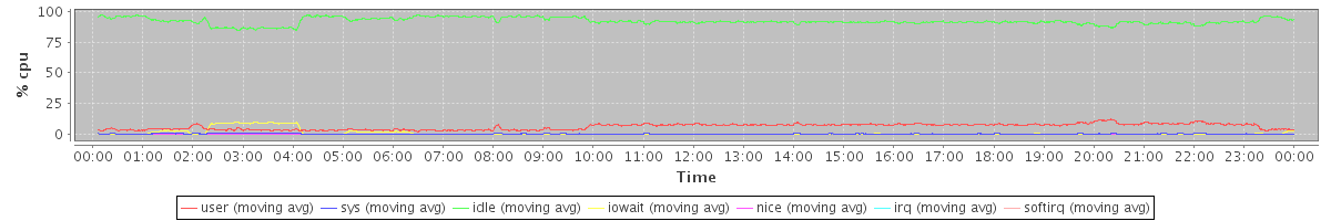 avg(user) = 6.25 avg(sys) = 0.42 avg(idle) = 92.01 avg(iowait) = 1.13 avg(nice) = 0.11 avg(irq) = 0.00 avg(softirq) = 0.07
