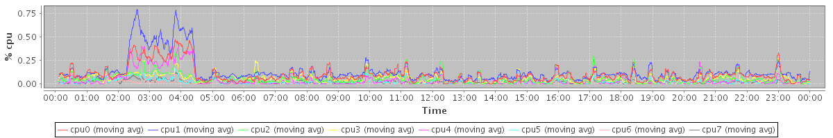 avg(cpu0) = 0.21 avg(cpu1) = 0.19 avg(cpu2) = 0.05 avg(cpu3) = 0.05 avg(cpu4) = 0.02 avg(cpu5) = 0.04 avg(cpu6) = 0.02 avg(cpu7) = 0.02