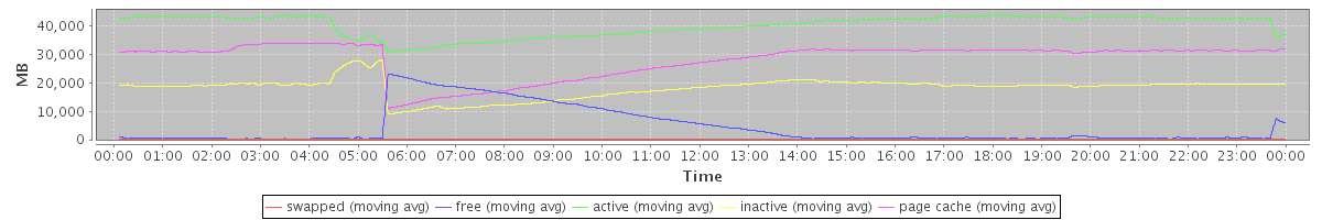 avg(swapped) = 6.65 avg(free) = 4470.52 avg(active) = 40216.66 avg(inactive) = 18214.78 avg(page cache) = 28197.36