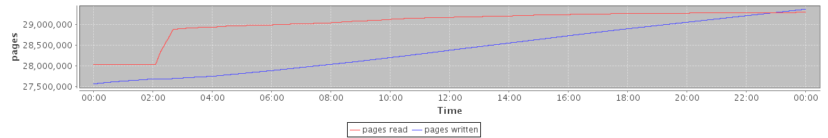 avg(pages read) = 29039231.91 avg(pages written) = 28402023.92