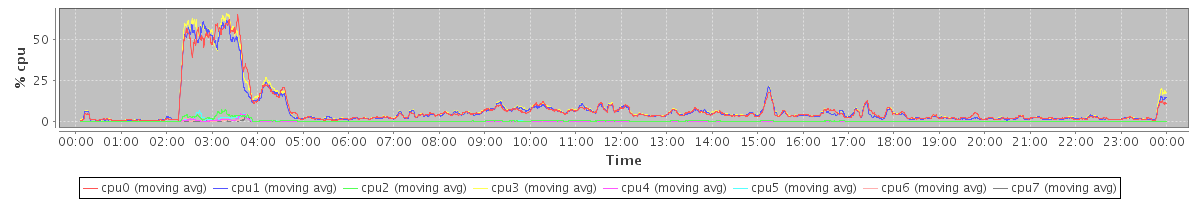 avg(cpu0) = 1.13 avg(cpu1) = 1.01 avg(cpu2) = 0.70 avg(cpu3) = 0.94 avg(cpu4) = 0.51 avg(cpu5) = 0.46 avg(cpu6) = 0.34 avg(cpu7) = 0.30