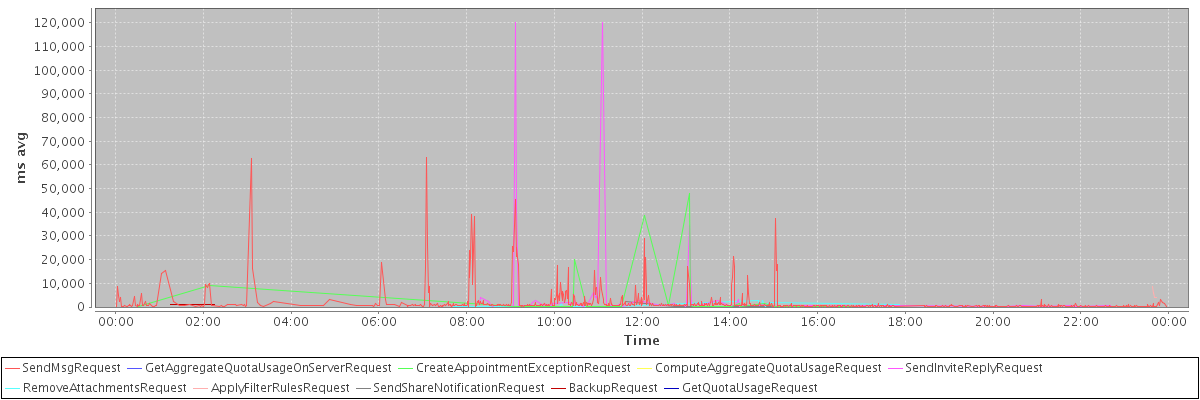 avg(SendMsgRequest) = 1769.67 avg(GetAggregateQuotaUsageOnServerRequest) = 4382.00 avg(CreateAppointmentExceptionRequest) = 3685.56 avg(ComputeAggregateQuotaUsageRequest) = 4554.00 avg(SendInviteReplyRequest) = 4163.64 avg(RemoveAttachmentsRequest) = 902.89 avg(ApplyFilterRulesRequest) = 5789.40 avg(SendShareNotificationRequest) = 946.33 avg(BackupRequest) = 1148.00 avg(GetQuotaUsageRequest) = 5149.00