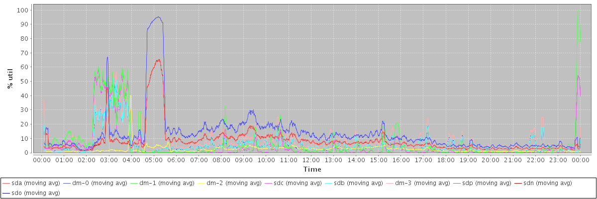 avg(sda) = 8.37 avg(dm-0) = 13.60 avg(dm-1) = 6.84 avg(dm-2) = 2.28 avg(sdc) = 5.13 avg(sdb) = 6.02 avg(dm-3) = 7.97 avg(sdp) = 5.15 avg(sdn) = 8.40 avg(sdo) = 6.02