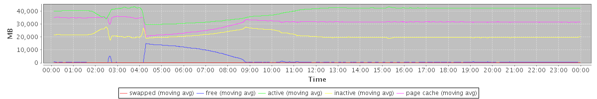 avg(swapped) = 3.46 avg(free) = 2340.67 avg(active) = 39383.14 avg(inactive) = 21027.91 avg(page cache) = 30994.27