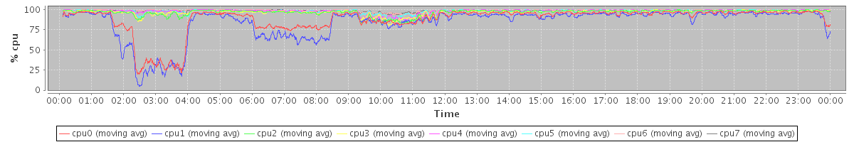 avg(cpu0) = 7.13 avg(cpu1) = 10.72 avg(cpu2) = 0.37 avg(cpu3) = 0.28 avg(cpu4) = 0.08 avg(cpu5) = 0.16 avg(cpu6) = 0.01 avg(cpu7) = 0.05