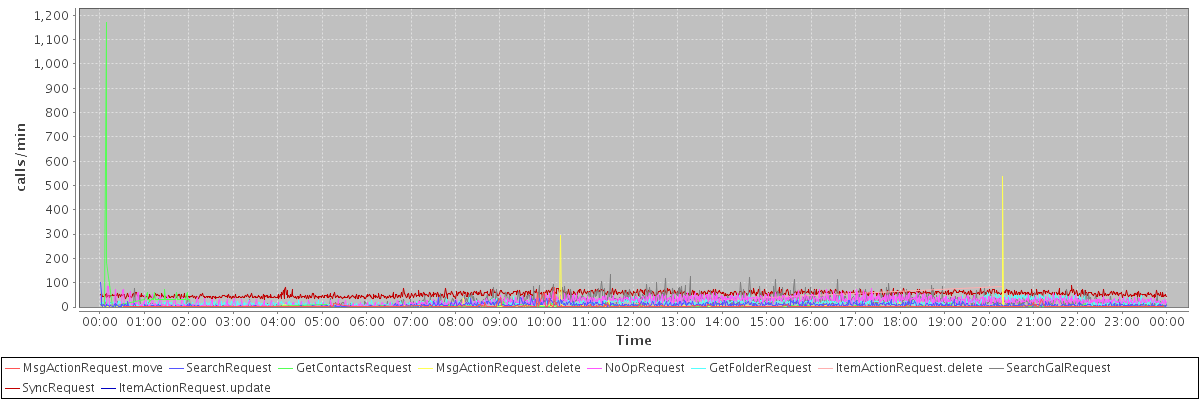 max(MsgActionRequest.move) = 80.00 max(SearchRequest) = 99.00 max(GetContactsRequest) = 1171.00 max(MsgActionRequest.delete) = 536.00 max(NoOpRequest) = 84.00 max(GetFolderRequest) = 60.00 max(ItemActionRequest.delete) = 86.00 max(SearchGalRequest) = 133.00 max(SyncRequest) = 88.00 max(ItemActionRequest.update) = 64.00