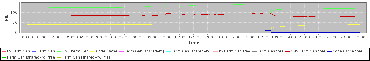 avg(PS Perm Gen) = 0.00 avg(Perm Gen) = 0.00 avg(CMS Perm Gen) = 126.29 avg(Code Cache) = 38.19 avg(Perm Gen [shared-ro]) = 0.00 avg(Perm Gen [shared-rw]) = 0.00 avg(PS Perm Gen free) = 0.00 avg(Perm Gen free) = 0.00 avg(CMS Perm Gen free) = 85.54 avg(Code Cache free) = 5.55 avg(Perm Gen [shared-ro] free) = 0.00 avg(Perm Gen [shared-rw] free) = 0.00