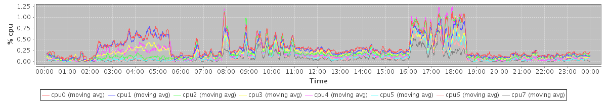 avg(cpu0) = 0.33 avg(cpu1) = 0.28 avg(cpu2) = 0.22 avg(cpu3) = 0.21 avg(cpu4) = 0.22 avg(cpu5) = 0.13 avg(cpu6) = 0.12 avg(cpu7) = 0.08