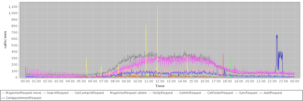 max(MsgActionRequest.move) = 380.00 max(SearchRequest) = 167.00 max(GetContactsRequest) = 324.00 max(MsgActionRequest.delete) = 1117.00 max(NoOpRequest) = 399.00 max(GetInfoRequest) = 122.00 max(GetFolderRequest) = 218.00 max(SyncRequest) = 418.00 max(AuthRequest) = 122.00 max(GetAppointmentRequest) = 669.00