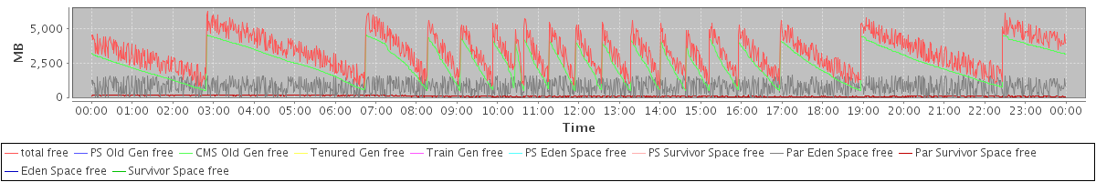 avg(total free) = 3334.18 avg(PS Old Gen free) = 0.00 avg(CMS Old Gen free) = 2452.76 avg(Tenured Gen free) = 0.00 avg(Train Gen free) = 0.00 avg(PS Eden Space free) = 0.00 avg(PS Survivor Space free) = 0.00 avg(Par Eden Space free) = 786.69 avg(Par Survivor Space free) = 94.72 avg(Eden Space free) = 0.00 avg(Survivor Space free) = 0.00