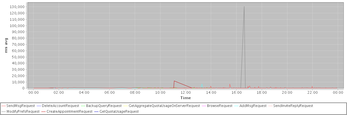avg(SendMsgRequest) = 397.72 avg(DeleteAccountRequest) = 844.00 avg(BackupQueryRequest) = 355.17 avg(GetAggregateQuotaUsageOnServerRequest) = 2594.00 avg(BrowseRequest) = 384.00 avg(AddMsgRequest) = 223.88 avg(SendInviteReplyRequest) = 249.00 avg(ModifyPrefsRequest) = 1103.89 avg(CreateAppointmentRequest) = 406.88 avg(GetQuotaUsageRequest) = 2544.00