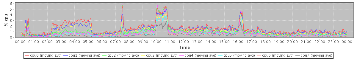 avg(cpu0) = 11.69 avg(cpu1) = 9.79 avg(cpu2) = 6.13 avg(cpu3) = 8.25 avg(cpu4) = 4.82 avg(cpu5) = 4.11 avg(cpu6) = 3.98 avg(cpu7) = 2.81
