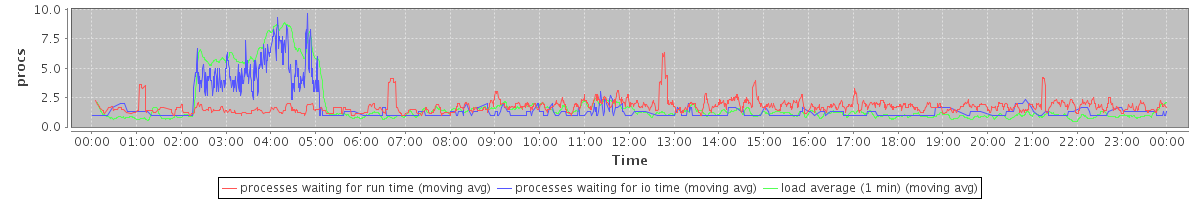 avg(processes waiting for run time) = 1.07 avg(processes waiting for io time) = 0.76 avg(load average (1 min)) = 1.82