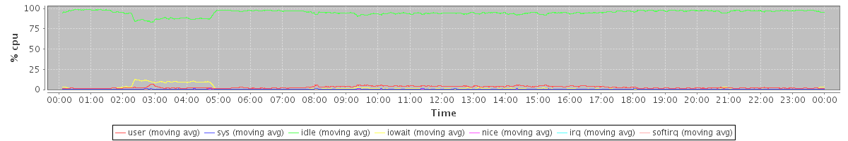 avg(user) = 2.77 avg(sys) = 0.51 avg(idle) = 94.77 avg(iowait) = 1.78 avg(nice) = 0.12 avg(irq) = 0.00 avg(softirq) = 0.05