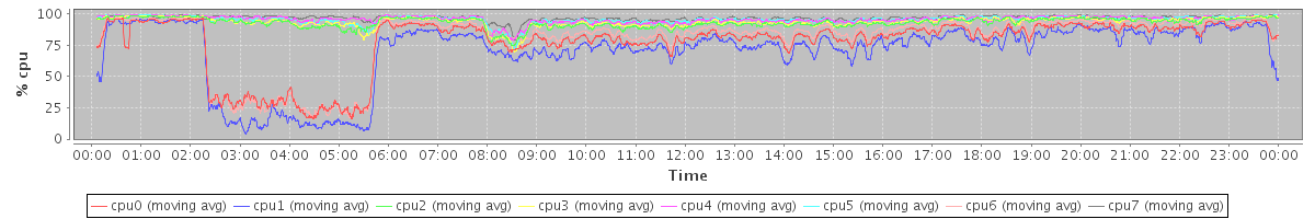 avg(cpu0) = 77.45 avg(cpu1) = 70.46 avg(cpu2) = 93.26 avg(cpu3) = 93.79 avg(cpu4) = 95.87 avg(cpu5) = 95.89 avg(cpu6) = 80.35 avg(cpu7) = 96.77