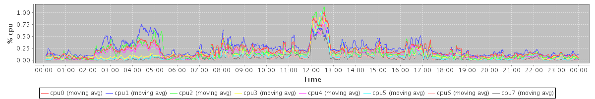 avg(cpu0) = 1.45 avg(cpu1) = 1.49 avg(cpu2) = 1.10 avg(cpu3) = 1.06 avg(cpu4) = 1.11 avg(cpu5) = 0.80 avg(cpu6) = 0.60 avg(cpu7) = 0.58