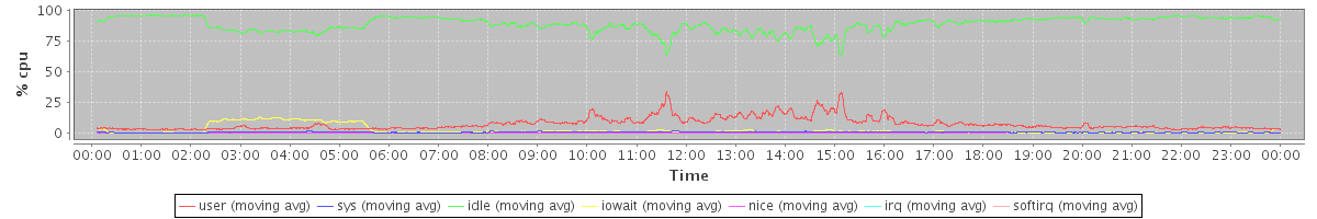 avg(user) = 7.55 avg(sys) = 0.72 avg(idle) = 89.25 avg(iowait) = 2.29 avg(nice) = 0.11 avg(irq) = 0.00 avg(softirq) = 0.09