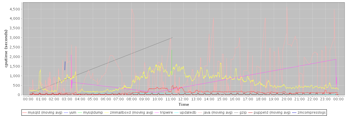 avg(mysqld) = 131.46 avg(yum) = 241.00 avg(mysqldump) = 1921.00 avg(zmmailboxd) = 657.70 avg(tripwire) = 880.53 avg(updatedb) = 54.70 avg(java) = 702.18 avg(gzip) = 2584.43 avg(puppetd) = 18.64 avg(zmcompresslogs) = 1519.50