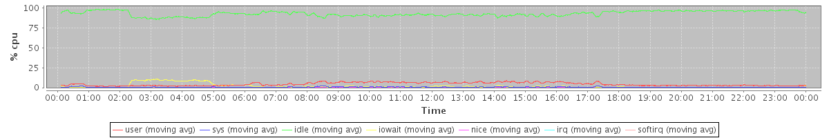 avg(user) = 4.32 avg(sys) = 0.68 avg(idle) = 92.90 avg(iowait) = 1.85 avg(nice) = 0.14 avg(irq) = 0.00 avg(softirq) = 0.10