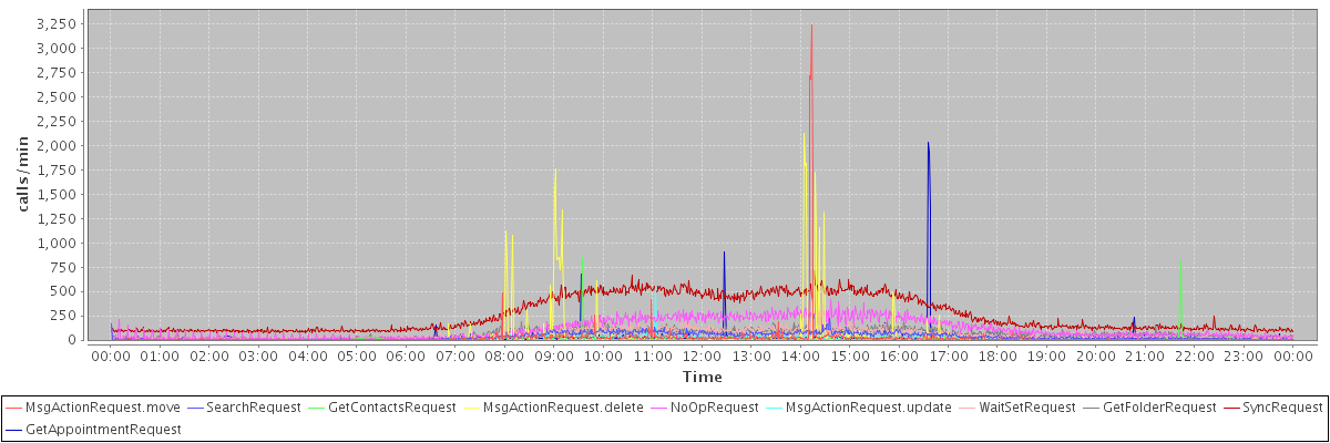 max(MsgActionRequest.move) = 3241.00 max(SearchRequest) = 221.00 max(GetContactsRequest) = 832.00 max(MsgActionRequest.delete) = 2127.00 max(NoOpRequest) = 606.00 max(MsgActionRequest.update) = 559.00 max(WaitSetRequest) = 210.00 max(GetFolderRequest) = 260.00 max(SyncRequest) = 713.00 max(GetAppointmentRequest) = 2031.00