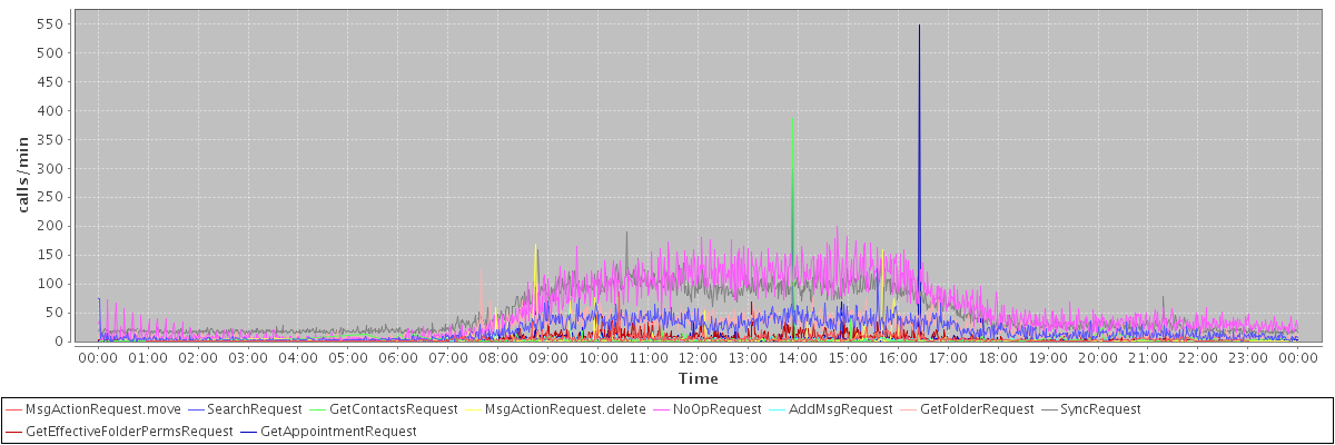 max(MsgActionRequest.move) = 85.00 max(SearchRequest) = 127.00 max(GetContactsRequest) = 386.00 max(MsgActionRequest.delete) = 168.00 max(NoOpRequest) = 200.00 max(AddMsgRequest) = 73.00 max(GetFolderRequest) = 126.00 max(SyncRequest) = 190.00 max(GetEffectiveFolderPermsRequest) = 69.00 max(GetAppointmentRequest) = 548.00