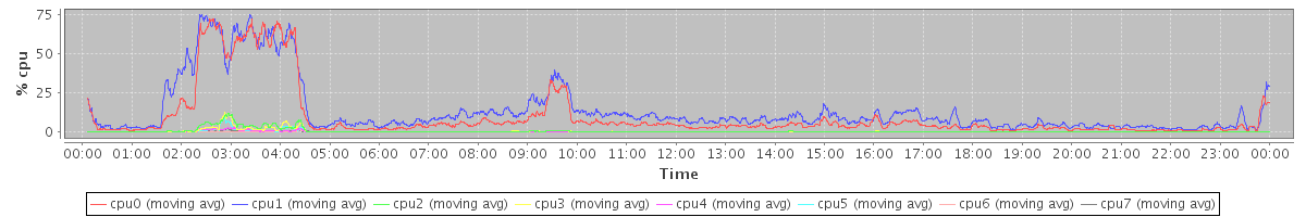 avg(cpu0) = 9.63 avg(cpu1) = 13.53 avg(cpu2) = 0.56 avg(cpu3) = 0.46 avg(cpu4) = 0.14 avg(cpu5) = 0.24 avg(cpu6) = 0.03 avg(cpu7) = 0.10