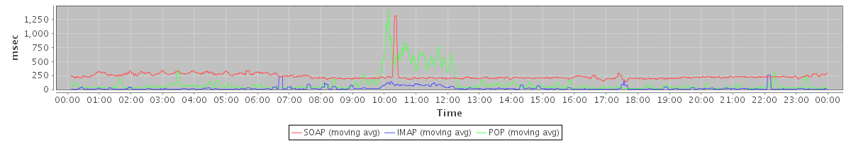 avg(DeleteAccountRequest) = 20046.00 avg(GetAggregateQuotaUsageOnServerRequest) = 8253.00 avg(GetFreeBusyRequest) = 442.97 avg(FolderActionRequest.delete) = 808.00 avg(SendInviteReplyRequest) = 463.67 avg(ApplyFilterRulesRequest) = 3739.00 avg(ForwardAppointmentRequest) = 516.00 avg(BackupRequest) = 2408.00 avg(MsgActionRequest.copy) = 1293.40 avg(GetQuotaUsageRequest) = 9765.00